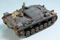 The base kit was the Trumpeter StuG III Ausf B which was backdated using the front hull armour of the Revell Pz III Ausf L with modified hatches. The road wheels and track were also from the Revell Pz III and the early sprocket wheel was from the Dragon Hornisse. All the moulded on tools were removed from the fenders and replaced with scratchbuilt and resin tools. Many parts such as the stowage boxes, bolted on front armour and smoke candle rack were scratchbuilt, and etched brass details from the spares box were added. It was primed with Tamiya Fine Surface Primer and painted with Humbrol enamels, weathered with oil paints and MIG pigments. Decals were by Peddinghaus, and the figure by Prieser.